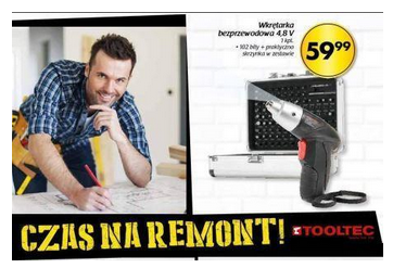 Ostoją wyłącznie męskiej aktywności jest remont i wędkarstwo. A jeśli remont, to na pewno w ramach ilustracji zobaczymy mężczyznę trzymającego wiertarkę (Biedronka, NETTO). Tak jest za każdym razem i w każdej sieci. Co ciekawe, coraz częściej to kobiety ilustrują gazetki przedstawiające sprzęt elektroniczny (np. Tesco).