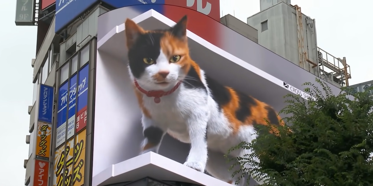 W Shinjuku – tętniącej życiem dzielnicy Tokio – niedawno pojawił się ogromny billboard z hiperrealistyczną trójwymiarową wizualizacją przedstawiającą kota. Mimo że wizualizacja pojawiła się wśród mnóstwa innych reklam, obok tego billboardu ludzie nie przechodzili obojętnie.