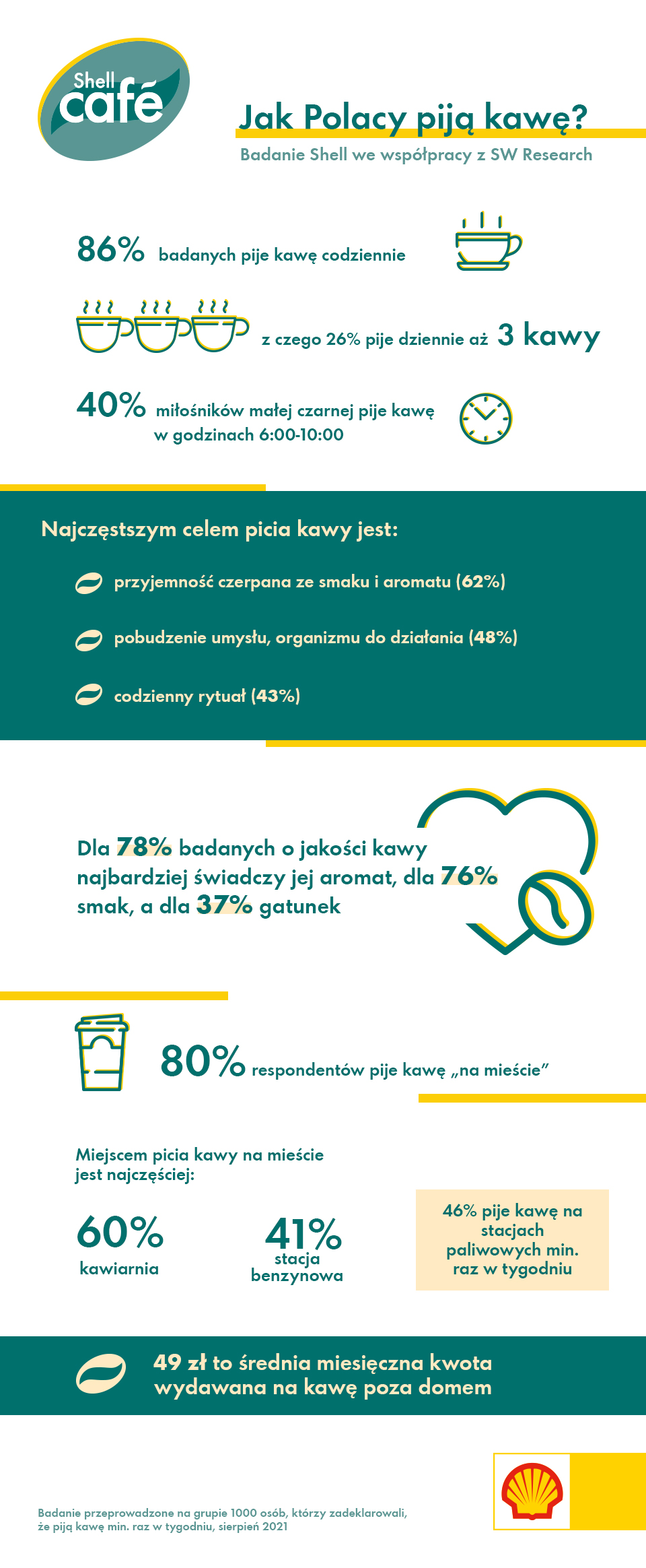 Jak wynika z badań SW Research 1 przeprowadzonych na zlecenie Shell Polska 86 proc. respondentów pije kawę codziennie, z czego 26 proc. pije aż trzy kawy dziennie. 40 proc. badanych pije ją w godzinach porannych pomiędzy 6:00 a 10.00. Najczęstszym celem picia tego czarnego napoju jest przyjemność czerpana z aromatu (62 proc.), chęć pobudzenia umysłu i organizmu do działania (48 proc.) czy po prostu codzienny rytuał (43 proc.).