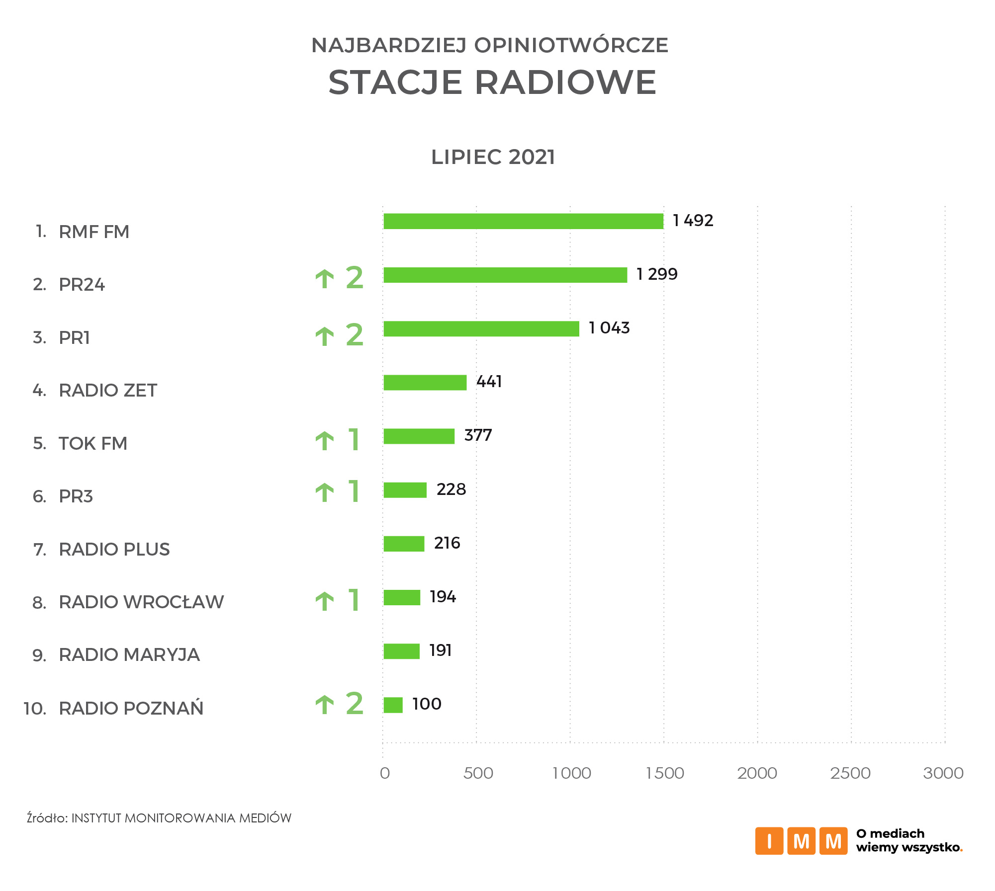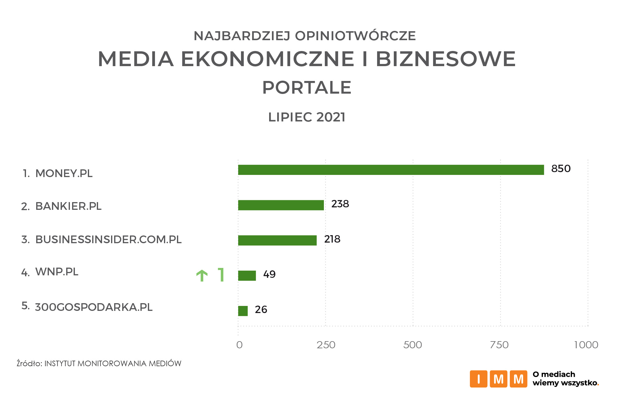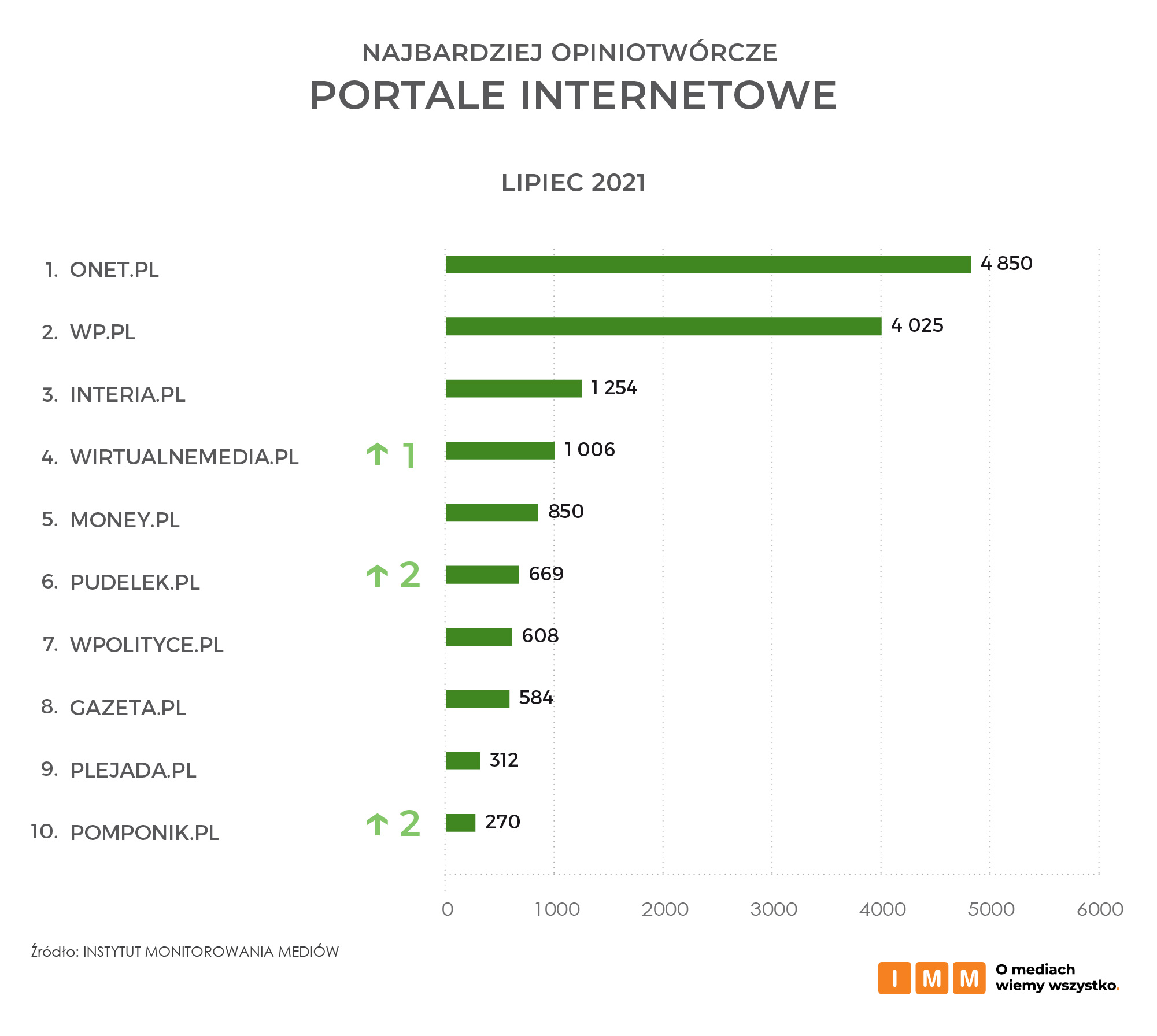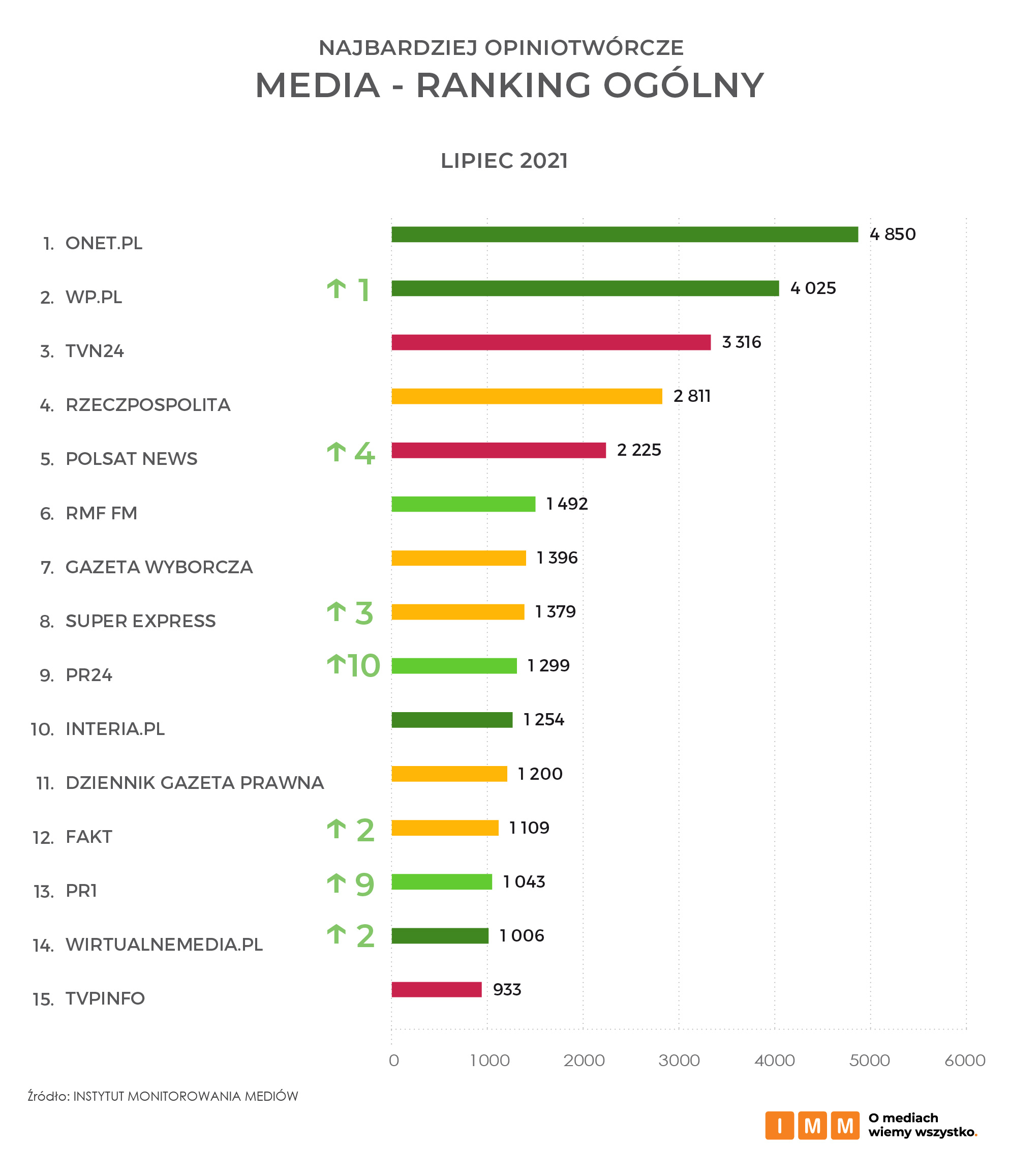 Najczęściej cytowanym medium przez inne redakcje w Polsce pozostaje Onet. Wzrostową pozycję o jedno oczko uzyskał portal WP, zajmując tym samym drugie miejsce. Podium zamyka stacja TVN24. Najwyższe zmiany odnotowały natomiast Polskie Radio 24 i Program Pierwszy Polskiego Radia – kolejno dziesięć i dziewięć miejsc w stosunku do czerwca br. – wynika z raportu „Najbardziej opiniotwórczych mediów w Polsce” za lipiec 2021 przygotowanego przez Instytut Monitorowania Mediów (IMM).