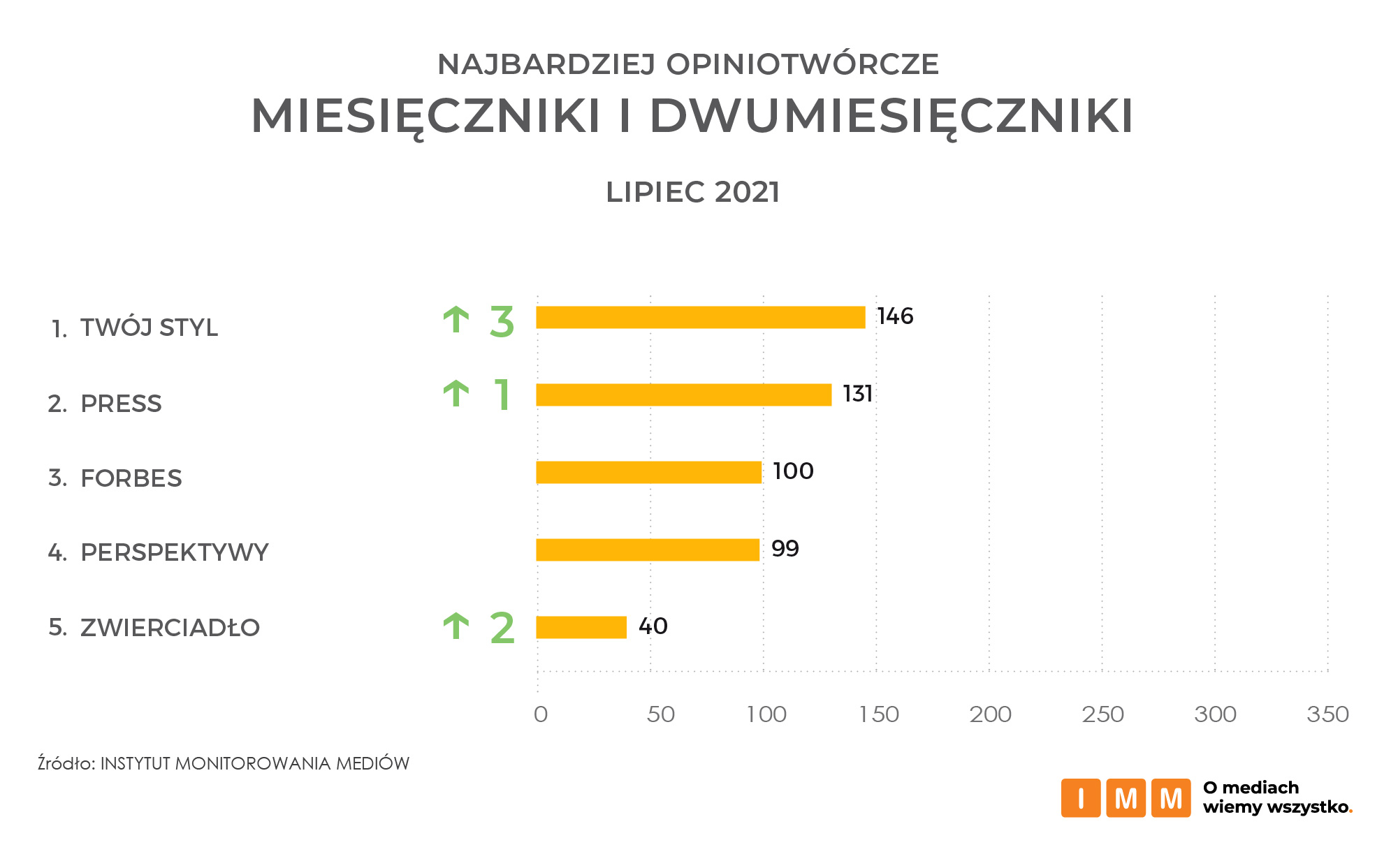 Pierwsze miejsce rankingu zajmuje miesięcznik Twój Styl, cytowany w lipcu łącznie 146 razy między innymi za sprawą wywiadu na łamach sierpniowego numeru z aktorką Anną Dereszowską. Pozycja druga należy do branżowego tytułu Press z wynikiem 131 powołań w innych mediach i wzrostem o jedno oczko. Podium zamyka magazyn Forbes z liczbą 100 wzmianek. Kolejno miejsce czwarte i piąte zajmują Perspektywy (99) i Zwierciadło (40).