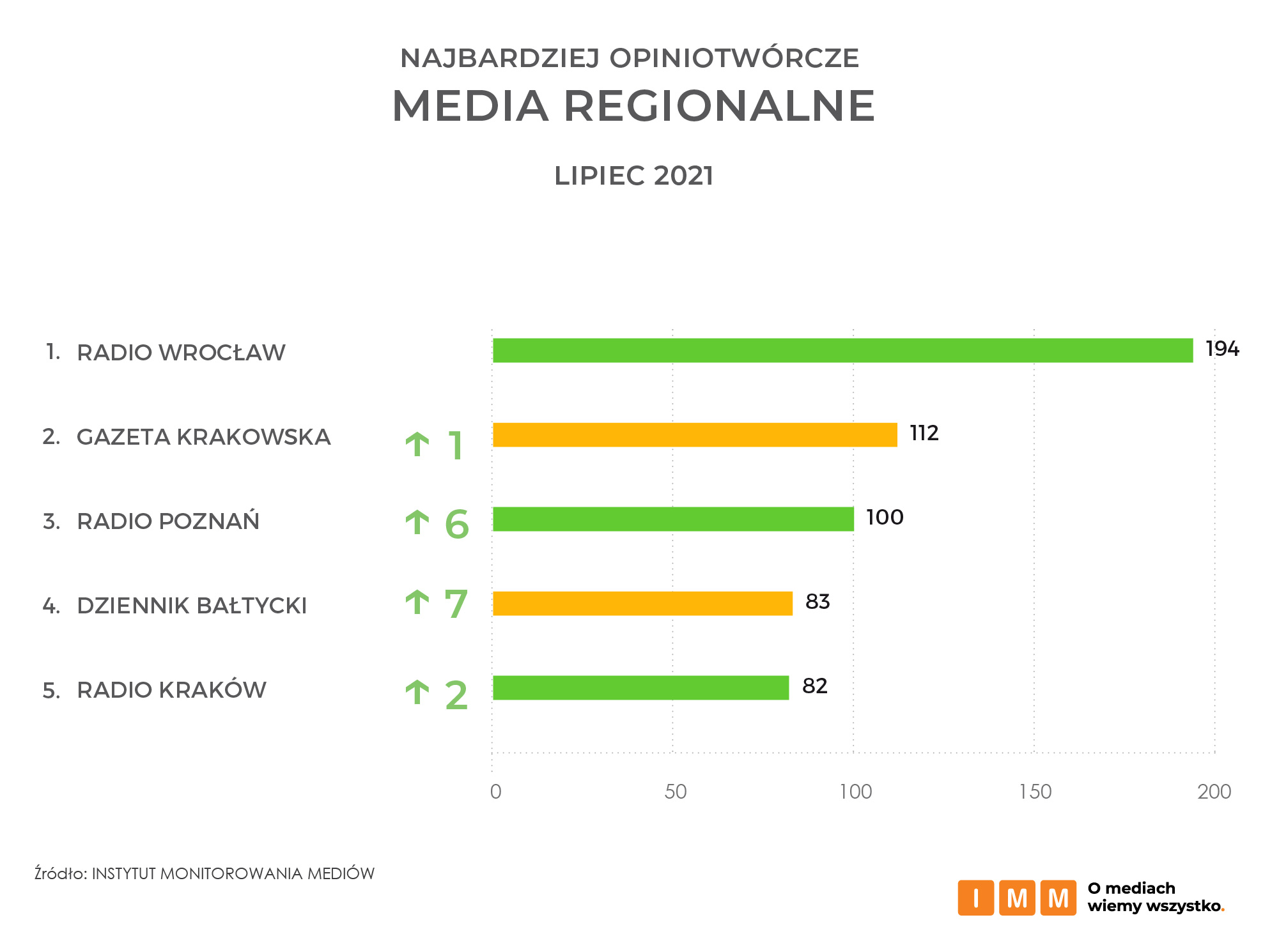 Liderem kategorii mediów regionalnych w lipcu 2021 pozostaje Radio Wrocław, na które inne redakcje w kraju powoływały się w lipcu 194 razy. Rozgłośnia gościła na antenie między innymi ministra zdrowia Adama Niedzielskiego, którego pytano o sytuację szczepień w kraju. Wzrost o sześć oczek odnotowało Radio Poznań, plasując się tym samym na miejscu trzecim z wynikiem 100 wzmianek. Pozycja czwarta to z kolei najwyższy awans w rankingu aż o siedem pozycji i dotyczy on Dziennika Bałtyckiego (83). Redakcja gazety jako pierwsza informowała, iż Disney pracuje nad filmem opartym na scenariuszu polskich twórców i którego akcja ma rozgrywać się w Polsce. Ranking zamyka natomiast Radio Kraków z liczbą 82 materiałów w innych mediach.