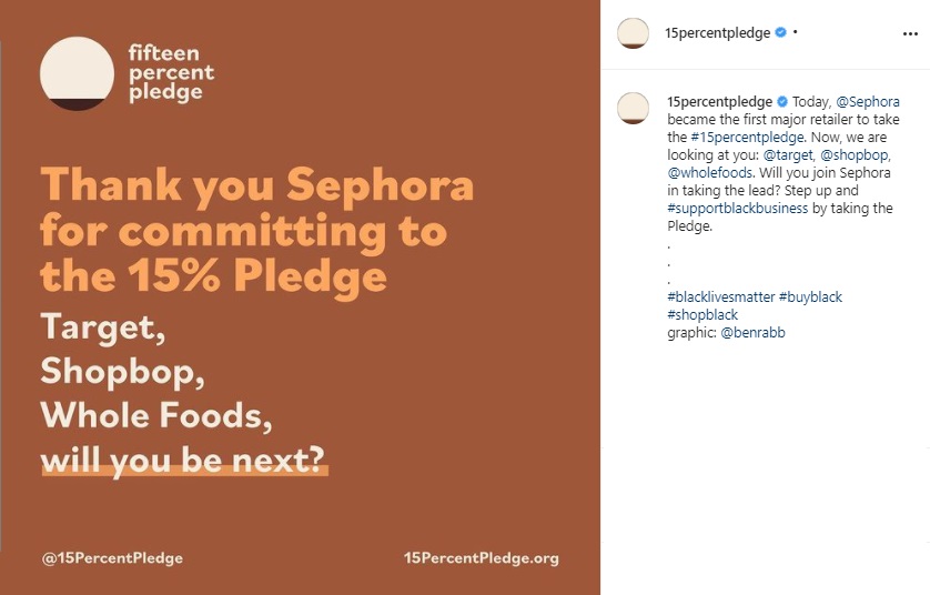 Sprzedaż specjalnego zestawu Sephora została powiązana z akcją 15percentpledge, która polega na przeznaczaniu przez detalistów co najmniej 15% powierzchni swoich półek na asortyment należący do czarnych producentów. Dlaczego akurat 15 %? Właśnie taki odsetek populacji Stanów Zjednoczonych stanowią czarne osoby. Piętnastoprocentową obietnicę, oprócz Sephory, zadeklarowały już takie marki, jak VOGUE, GAP czy Banana Republic.