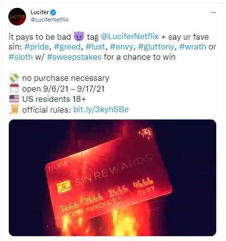 Do 17 września fani „Lucyfera” mają szansę „zarobić na grzechu” przez udział w loterii prowadzonej w mediach społecznościowych. Netflix zachęca, by w komentarzach na koncie LuciferNetflix na Twitterze i Instagramie podzielić się swoimi ulubionymi grzechami, wybierając spośród siedmiu głównych: obżarstwa, dumy, pożądliwości, gniewu, chciwości, zazdrości i lenistwa, dodatkowo dodając hashtag #sweepstakes.