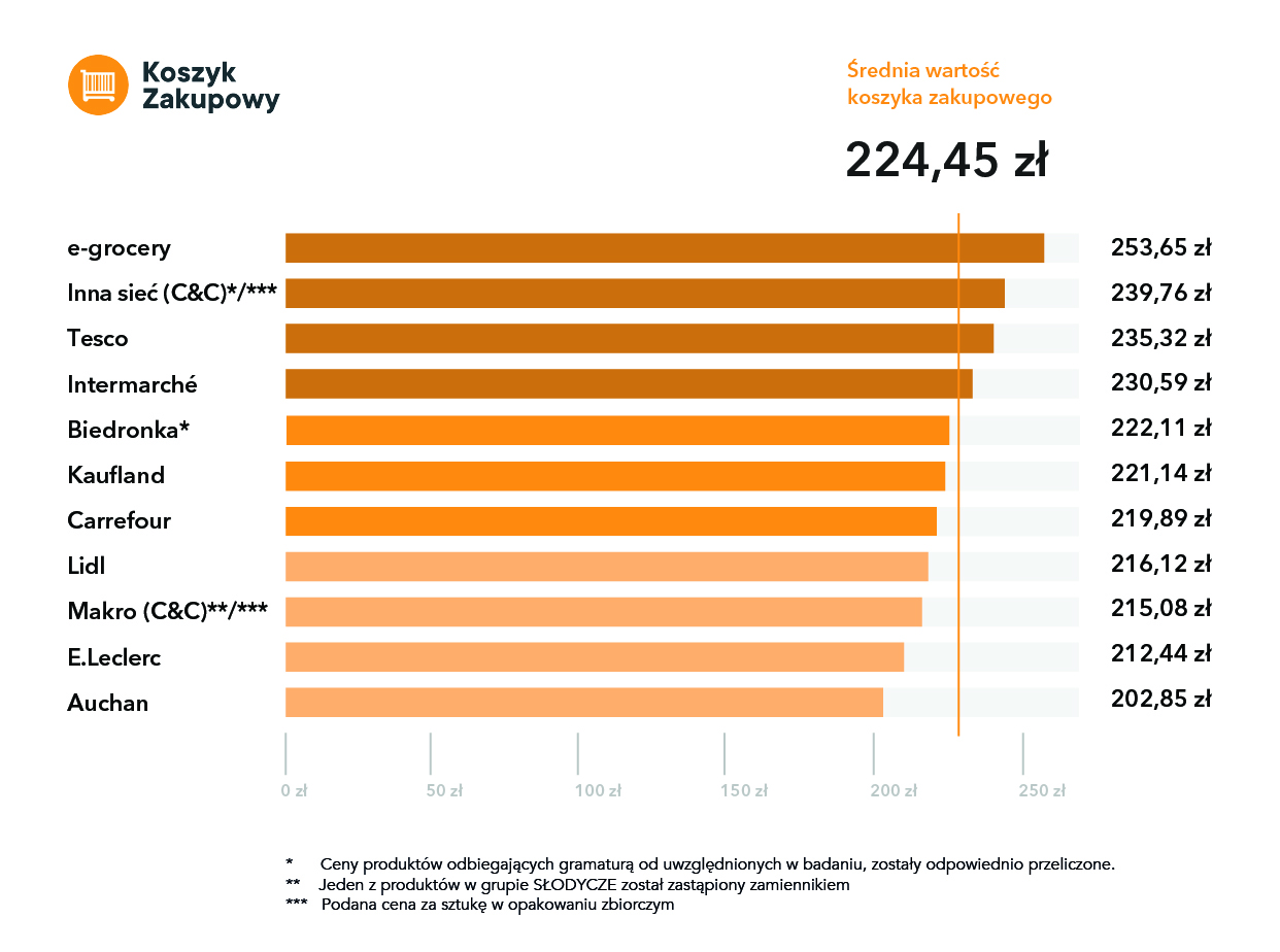 Najwięcej w zeszłym miesiącu trzeba było wydać w innej sieci Cash&Carry, gdzie wartość zakupów wyniosła 239,76 zł, czyli o ponad 18% więcej niż w najtańszych sklepach Auchan. Po raz kolejny e-grocery pozostaje najdroższym kanałem zakupów. Tam średnia suma koszyka zakupowego kształtowała się na poziomie 253,65 zł, co stanowi spadek cen w tym kanale o 4,76 zł (1,84 %) wobec lipca.