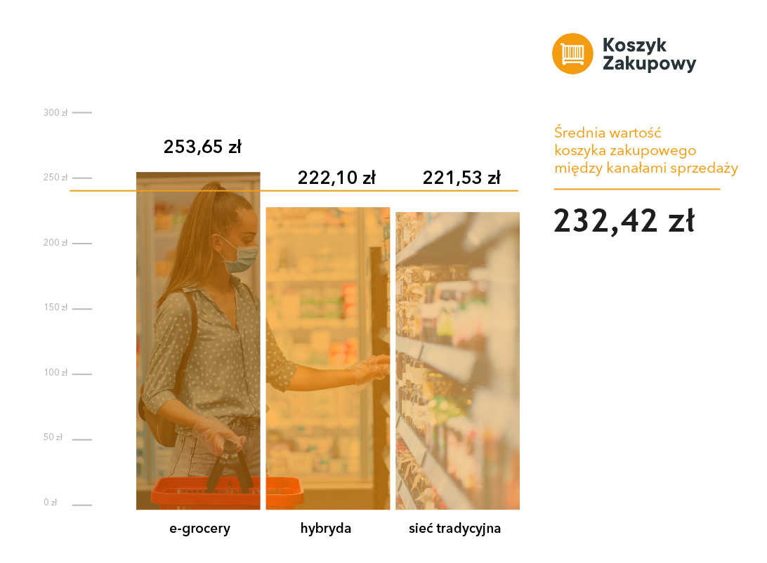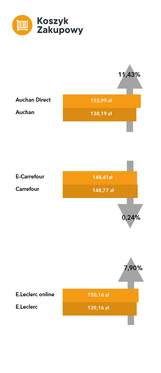 Sierpień 2021 r. przyniósł nieznaczny spadek cen w kanale e-grocery w stosunku do lipca br. Koszt zakupów online spadł o 1,84% względem lipca. Obecnie spośród 10 analizowanych grup produktów ponownie 5 było najdroższych w tym kanale sprzedaży. Najwięcej najtańszych grup produktowych (3) można było znaleźć w sieciach: Auchan (mięso, wędliny, ryby, produkty tłuszczowe, produkty sypkie) i Makro (mrożonki, nabiał i napoje). Dwie najtańsze grupy produktów stwierdzono w sieci Lidl (chemia domowa i kosmetyki, dodatki). Ani jednej najtańszej grupy produktów, podobnie jak w zeszłym miesiącu, nie było w sierpniu w kanale e-grocery oraz w sieciach: Biedronka, Intermarché, Kaufland, Tesco oraz w innej sieci Cash&Carry.