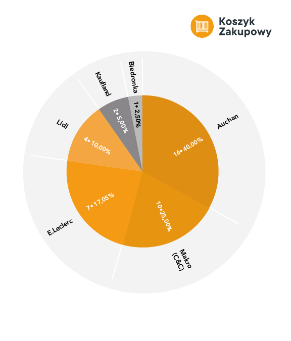 W sierpniu pozycję lidera rankingu ponownie zajęła sieć Auchan, którą w zeszłym miesiącu wyprzedziły sklepy Lidl. Za zestaw analizowanych produktów w sklepach sieci Auchan należało zapłacić 202,85 zł. To aż o 10,66 zł mniej niż najtańszy lipcowy koszyk Lidla.