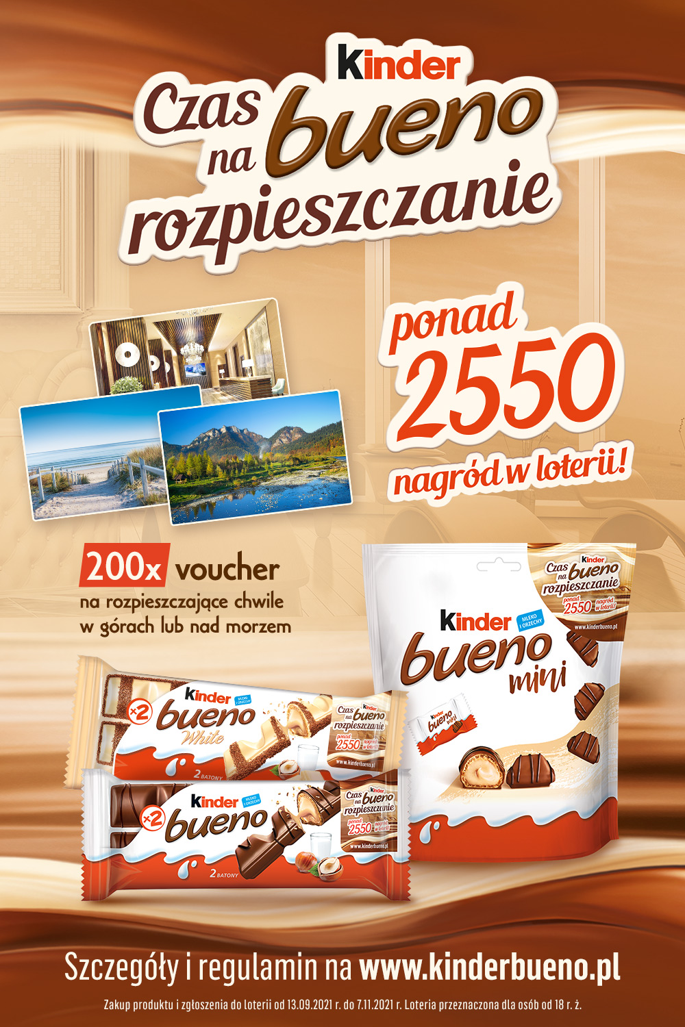 Kinder Bueno od lat rozpieszcza swoich konsumentów, dlatego również i tym razem fakt ten został podkreślony w komunikacji. W loterii „Czas na Kinder Bueno rozpieszczanie” do wygrania ponad 2550 nagród. Kupujący promocyjne opakowania Kinder Bueno, Kinder Bueno White i Kinder Bueno Mini, z zachowanym opakowaniem, mają szansę wygrać w loterii aż 200 wyjątkowych, 4-dniowych wyjazdów pełnych przyjemności dla dwojga w polskich górach lub na naszym wybrzeżu, a także 1120 voucherów do perfumerii Douglas i 1232 zestawy produktów Kinder Bueno.