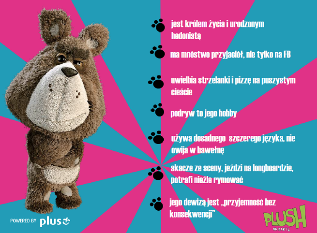 Plushak pojawił się w 2014 roku jako naturalna odpowiedź na reklamy nju mobile. Wyluzowany brand hero Plusa całkowicie zmienił i „odmłodził” wizerunek marki. Zadaniem Plushaka, który w spotach lubi imprezować ze swoimi ludzkimi przyjaciółmi (inspiracja filmem „Ted”), było wypromowanie nowej oferty Plush na Kartę, która jest skierowana do młodszych odbiorców (16– 24 lat). Plushakowi towarzyszyło hasło „Bez konsekwencji”, które w pewien sposób podsumowuje sposób konsumowania, działania i widzenia świata przez młodsze pokolenie. Kreacje i teksty pojawiające się w grafikach i reklamach, mają charakter memów, dlatego są chwytliwe i oddziałują na emocje.