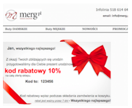 Sklep Merg.pl, wysyła na przykład do swoich klientów kody rabatowe z okazji urodzin. Dzięki temu udowadnia, że zna swoich klientów i pamięta o nich w ważnym dla nich dniu, przez co coraz bardziej ich do siebie przywiązuje. Co więcej przy większości okazjach i świętach takich jak np. Dzień Kobiet, Dzień Dziecka czy urodziny, konsumenci są skłonni do wydania większych kwot na produkty.