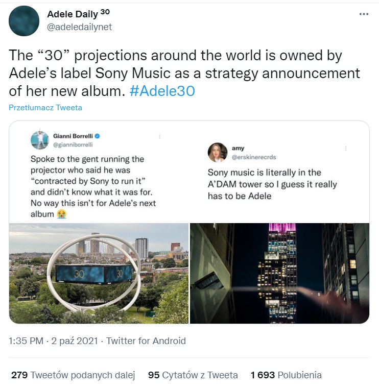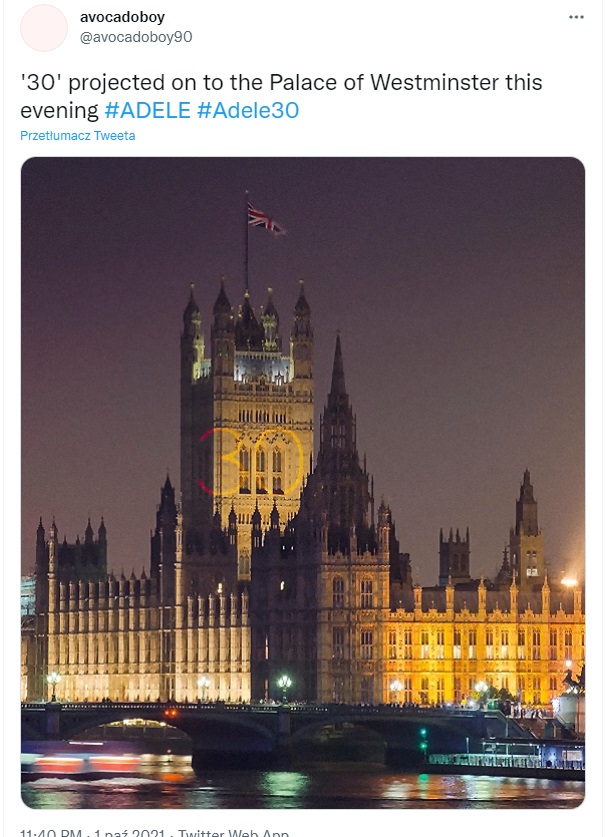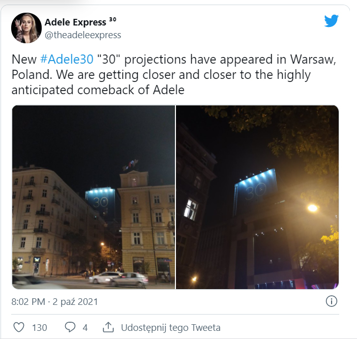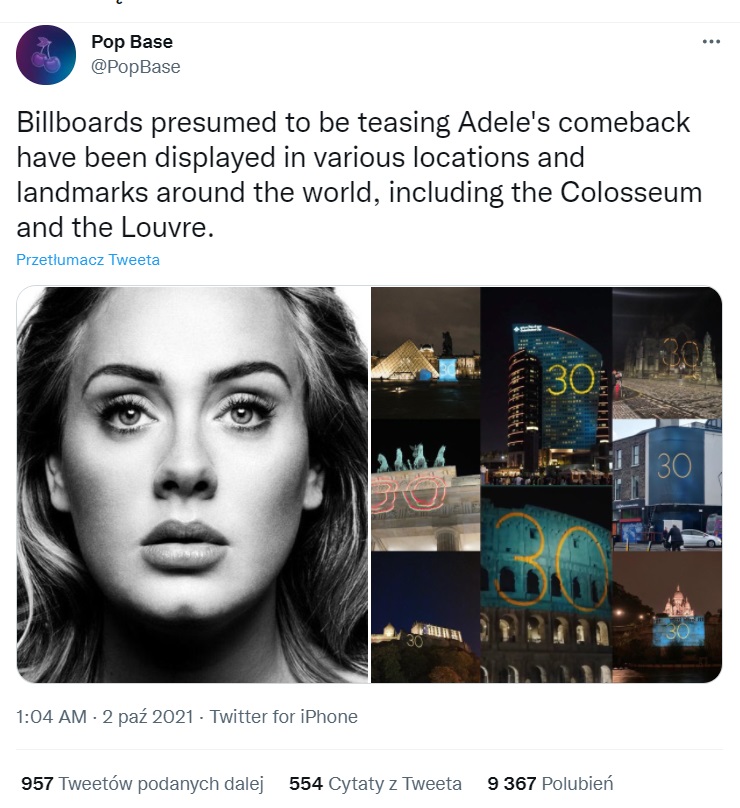 Paryski Luwr i Wieża Eiffla, Brama Brandenburska, rzymskie Koloseum i londyński Pałac Buckingham, nowojorski Empire State Building, a nawet Chrystus Odkupiciel w Rio de Janeiro – w tym miejscach pojawiła się liczba „30″, której znaczenia początkowo nikt nie znał. Okazuje się jednak, że z tak dużym rozmachem do promocji nowej płyty podeszła wytwórnia zajmująca się produkcją nowej płyty Adele.