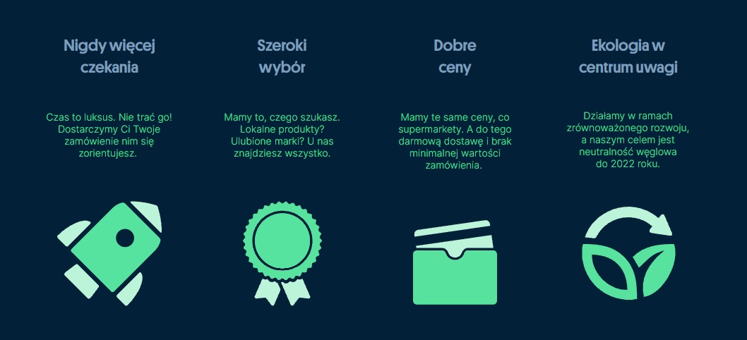 Polska aplikacja mobilna umożliwia zrobienie zakupów i bardzo szybkie dostarczenie ich przez kuriera w godzinach od 8 do 23, przez 7 dni w tygodniu. Jak zapewnia firma, dostarcza klientom zarówno artykuły spożywcze, jak i kosmetyki czy produkty dla dzieci.