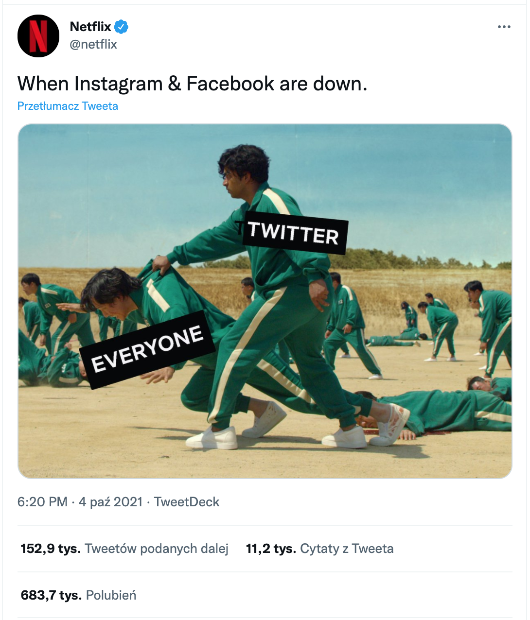Warto podać też przykład serwisu Netflix, który odniósł się do koronacji Twittera, jednocześnie nawiązując do ostatnio bijącego rekordy popularności południowokoreańskiego serialu „Squid game”:
