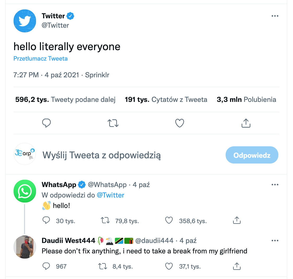 Sami użytkownicy na zwycięzcę poniedziałkowej sytuacji wytypowali Twittera, na którym Facebook komunikował oficjalnie problemy z działaniem. Niezliczone memy w zabawny sposób komentowały sytuację: