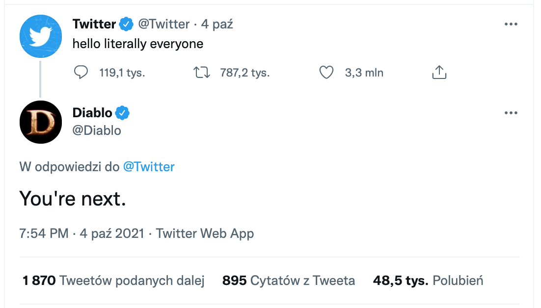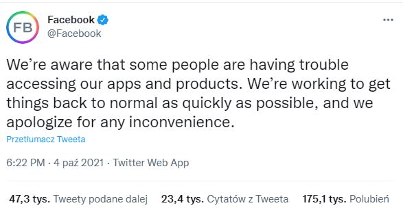 Zabrakło częstszych komunikatów co się dzieje i szybkiej informacji, że nie doszło do naruszenia integralności danych zgromadzonych przez serwisy. To, że nie do końca było wiadomo, co się dzieje, było oczywiście pożywką dla teorii spiskowych i fake newsów, które pojawiały się jak grzyby po deszczu. Mnożyły się obawy, że za awarią stoi atak hakerski, a nawet informacje, że część kodu Facebooka została, o zgrozo, skasowana.