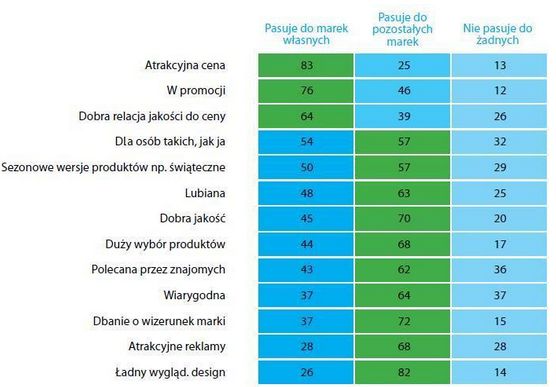 Jako atuty marki własnej konsumenci wskazują: atrakcyjną cenę (83%), promocje (76%) oraz dobrą relację jakości do ceny (64%). Aż 54% respondentów odpowiedziało, że marka własna skierowana jest do osób takich jak one. W tym pytaniu znane marki osiągnęły niemal ten sam wynik – 57%. Oznacza to, że marki własne są dobrze dopasowane do bieżących potrzeb konsumentów, a oni doceniają ich obecność na rynku. Jednak respondenci zupełnie inaczej traktują kwestię samej jakości produktów. Tylko 45% pytanych odpowiedziało, że wartość „dobra jakość” pasuje do produktów marek własnych, ale znacznie więcej (70%) tą samą cechę przypisałoby produktom znanych marek.