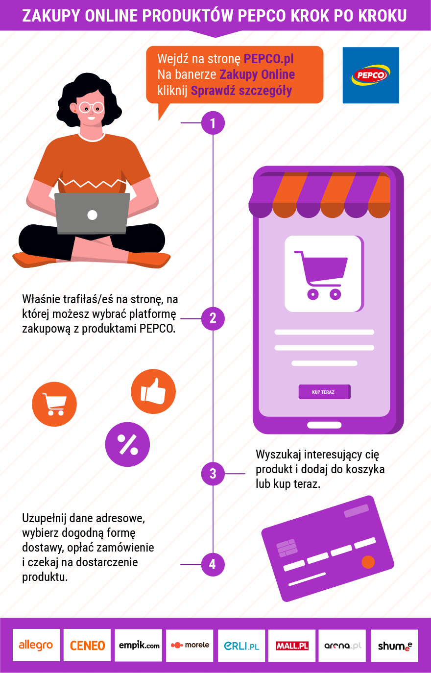 Proces zakupowy w internecie jest bardzo prosty i intuicyjny, nie tylko dla osób już korzystających z takich form zakupów. Wystarczy wejść na www.PEPCO.pl/zakupy-online i kliknąć w jedną z ośmiu ikon platform sprzedażowych. Klient automatycznie jest przekierowany do sekcji z produktami PEPCO na wybranej platformie, gdzie może przeglądać i zamawiać produkty z oferty sieci. Do wyboru jest zawsze kilka sposobów otrzymania zakupów, jak Paczkomat, kurier, czy dostępna darmowa dostawa przy wyborze opcji „ORLEN Paczka”. Każdy może również skorzystać bezpośrednio ze swojego ulubionego sklepu online, wpisując w jego wyszukiwarce słowo ‘Pepco’ i dalej filtrując według własnych potrzeb.
