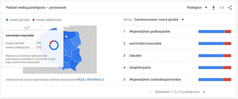 Przejdź do kolejnych wykresów i sprawdź zainteresowanie obydwiema frazami. Znajdziesz tu mapę i tabelę, które przedstawiają dane porównawcze na temat wprowadzonych przez Ciebie fraz. Jeśli prowadzisz sklep stacjonarny, sprawdź, które frazy są najczęściej wyszukiwane w Twoim regionie.
