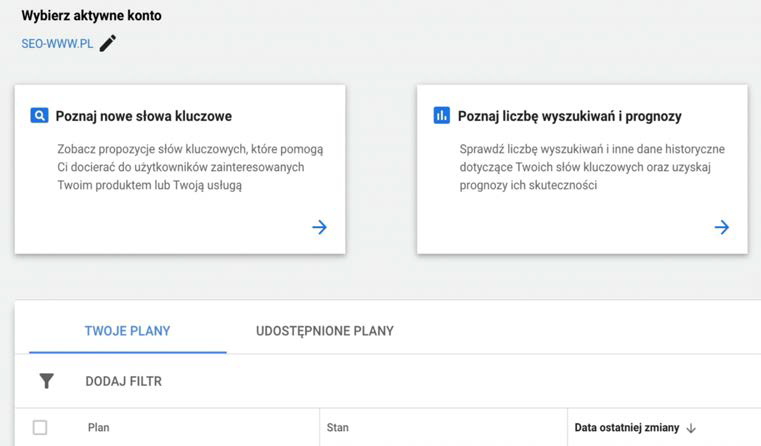 Dzięki pierwszej sekcji, Poznaj nowe słowa kluczowe, możesz znaleźć najpopularniejsze frazy związane z zakresem działalności Twojej firmy, produktami i usługami. Jeśli nie masz listy słów kluczowych, ta sekcja będzie dla Ciebie odpowiednia. Druga to Poznaj liczbę wyszukiwań i prognozy. Pozwala na dobranie dodatkowych słów kluczowych do obecnie posiadanych. Sprawdzisz tu liczbę wyszukiwań fraz w wyszukiwarce Google, a także liczbę kliknięć w reklamy w systemie reklamowym Google Ads.