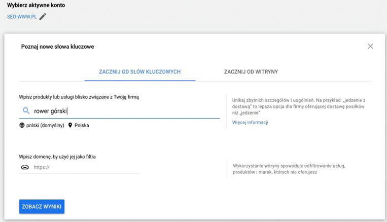 Przejdź do pierwszej sekcji Poznaj nowe słowa kluczowe, aby znaleźć nowe frazy dla swojej kampanii SEO. Planer słów kluczowych poprosi Cię o wskazanie szczegółów dotyczących produktów lub usług, które oferujesz. Poniżej wprowadź adres URL swojego sklepu internetowego lub strony internetowej, aby planer mógł przygotować propozycje fraz (pobrawszy dane takie jak nazwy kategorii lub nazwy produktów z Twojego sklepu internetowego). Jeśli chcesz poznać propozycje fraz tematycznie powiązanych z tą, którą obecnie wprowadzasz, nie musisz wskazywać żadnego adresu URL. Kliknij przycisk Zobacz wyniki.