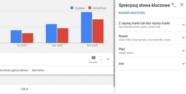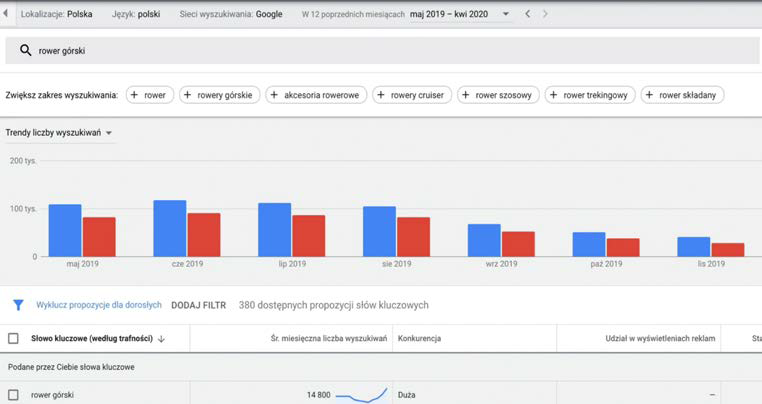 Domyślnie Planer słów kluczowych zastosował lokalizację polską i język polski, a wyniki zaczerpnął z wyszukiwarki Google. Standardowo widoczne są dane z 12 poprzednich miesięcy. Możesz zwiększyć zakres wyszukiwania dla swojej frazy, czyli dodać kolejne frazy do listy. Planer zaproponuje Ci także dodanie słów, które rozszerzą wyniki wyszukiwania. Dalej znajdziesz trendy związane z liczbą wyszukiwań, przedstawione w formie wykresu kolumnowego. Wyniki wyszukiwania dla danej frazy są podzielone na pochodzące z komputerów i ze smartfonów.