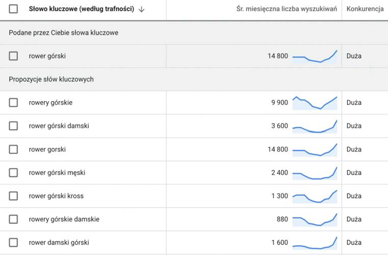 Pod trendami Planer słów kluczowych przedstawia propozycje fraz powiązanych z główną frazą. Ich listę warto wykorzystać podczas linkowania, a także w treści podstron i artykułów na blogu. Pierwsza kolumna zawiera listę słów kluczowych, która została domyślnie posortowana według trafności. Druga natomiast pokazuje średnią miesięczną liczbę wyszukiwań danej frazy (średnią z ostatnich 12 miesięcy). W następnej kolumnie Planer słów kluczowych ocenia stopień konkurencyjności danej frazy w odniesieniu do