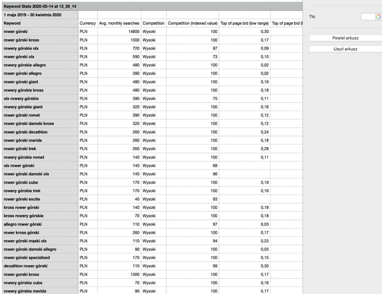 Podobnie jak w sekcji Poznaj nowe słowa kluczowe, także tutaj możesz wyeksportować listę fraz do pliku w formacie CSV.