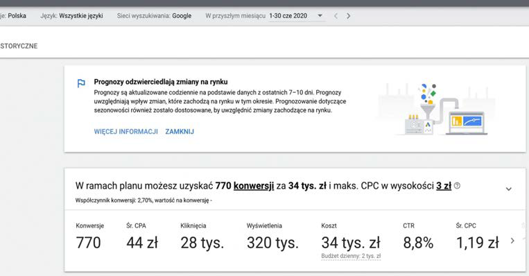 Po otrzymaniu wyników zwróć uwagę na zakładkę Prognozy, w której znajdziesz prognozowaną liczbę wyświetleń i kliknięć reklam w systemie reklamowym Google Ads.