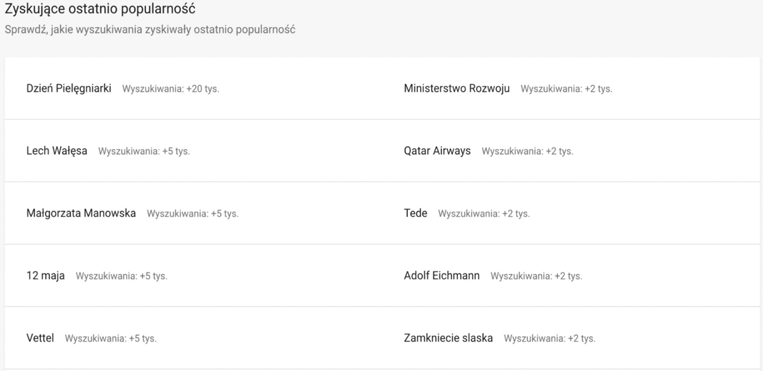 Dalej Google Trends proponuje pokrewne tematy, powiązane z wprowadzoną frazą, domyślnie posortowane według opcji Zyskujące popularność. Możesz tu znaleźć inne, równie popularne zapytania w wyszukiwarce Google.