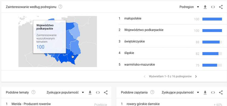Poniżej znajdziesz wykres popularności w ujęciu czasowym i mapę z podziałem na regiony. Zwróć uwagę na podział kraju i nałożone na poszczególne województwa kolory, które odpowiadają za zainteresowanie użytkowników wyszukiwaną frazą. Użyj tej funkcji, jeśli np. otwierasz sklep stacjonarny i zastanawiasz się, w którym regionie najbardziej byłoby to opłacalne. Ciemniejszy kolor wskazuje na największe zainteresowanie wśród użytkowników wyszukiwarki Google. Po prawej stronie znajdziesz te same dane, ale w formie tabeli.