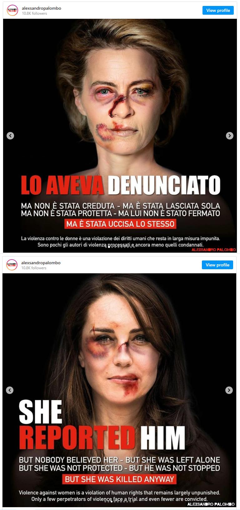 „Zgłosiła go, ale: nikt jej nie uwierzył, została sama, nie była chroniona – on nie został zatrzymany. I tak została zabita” – to mocne hasła i brutalne zdjęcia znanych kobiet miały przynieść rozgłos kampanii włoskiego artysty i aktywisty Alexsandro Palombo. Na jego plakatach pojawiły się pojedynczo: księżna Cambridge Kate Middleton, wiceprezydent USA Kamala Harris, hiszpańska królowa Letizia i szefowa Komisji Europejskiej Ursula von der Leyen. Wszystkie bohaterki łączy jedno – każda z nich wygląda na zdjęciach na brutalnie pobitą.