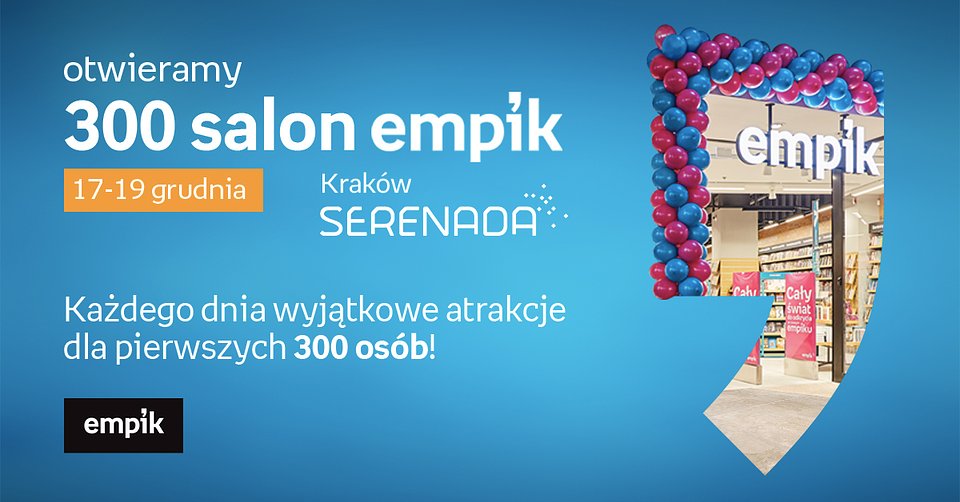 Empik nie zwalnia tempa ekspansji. W samym listopadzie i grudniu zaplanowano otwarcie 11 nowych salonów. Wśród nich jest inaugurujący działalność 17 grudnia 300. Empik w Polsce. Sklep znajduje się na parterze centrum handlowego Serenada w Krakowie i obejmuje powierzchnię ponad 300 mkw. To już dziesiąty Empik w sercu Małopolski. Do końca miesiąca na mapie pojawi się jeszcze pięć nowych sklepów – w Gdańsku (Rental Park), Warszawie (ul. Klimczaka, al. KEN, Lazurowa) i Andrychowie.