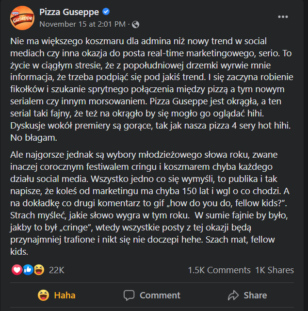 Czy znajdzie się ktoś, kto czytając teraz ten artykuł nie widział jeszcze poniższego wpisu na fanpage Pizzy Guseppe? Zakładam, że nie – a to wszystko dzięki temu, że szczere i żartobliwe wyznanie Admina podbiło serce internautów. Wpis wygenerował tysiące komentarzy i interakcji, a do akcji zaczęły podpinać się nawet inne marki.