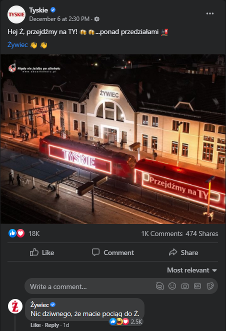 W momencie pisania przeze mnie tego podsumowania jest to całkiem świeża akcja. Muszę jednak przyznać, że od razu skradła moje serce. Podoba mi się pomysł, wykonanie i to lekkie (zupełnie nieobraźliwe) wzajemne zagranie obu marek na nosach. Pociąg Tyskiego pierwszy raz pojawił się w zeszłorocznej świątecznej kampanii marki. W tym roku marka Tyskie poszła o krok dalej i z reklamy przeniosła pociąg do rzeczywistości. Pociąg w ramach świątecznej kampanii „Przejdźmy na Ty ponad przedziałami” wyruszył w podróż po Polsce, nie zapominając też o… Żywcu! Tak, jest to zdecydowanie coś więcej niż akcja w SM, jednak post Tyskiego i zaczepna odpowiedź Żywca zaskarbiły sobie miejsce w moim zestawieniu.