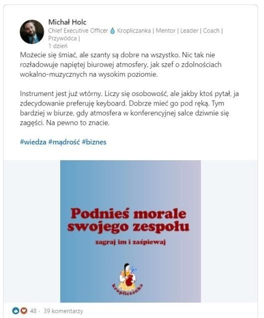 W październiku 2021 na Linkedinie zaczął udzielać się niejaki Michał Holc, chief executive officer w firmie Kropliczanka – lider, coach, przywódca oraz… fikcyjna postać z najnowszego serialu Canal+ –polskiej wersji popularnego „The Office”. Dopóki ktoś nie połączył odpowiednio kropek, część użytkowników Linkedin’a całkiem na poważnie brała jego (raczej nie do końca trafne) biznesowe porady. Nie ukrywam, że spędziłam dobrą godzinę na przeglądaniu wszystkich jego wpisów i komentarzy z szerokim uśmiechem na twarzy.