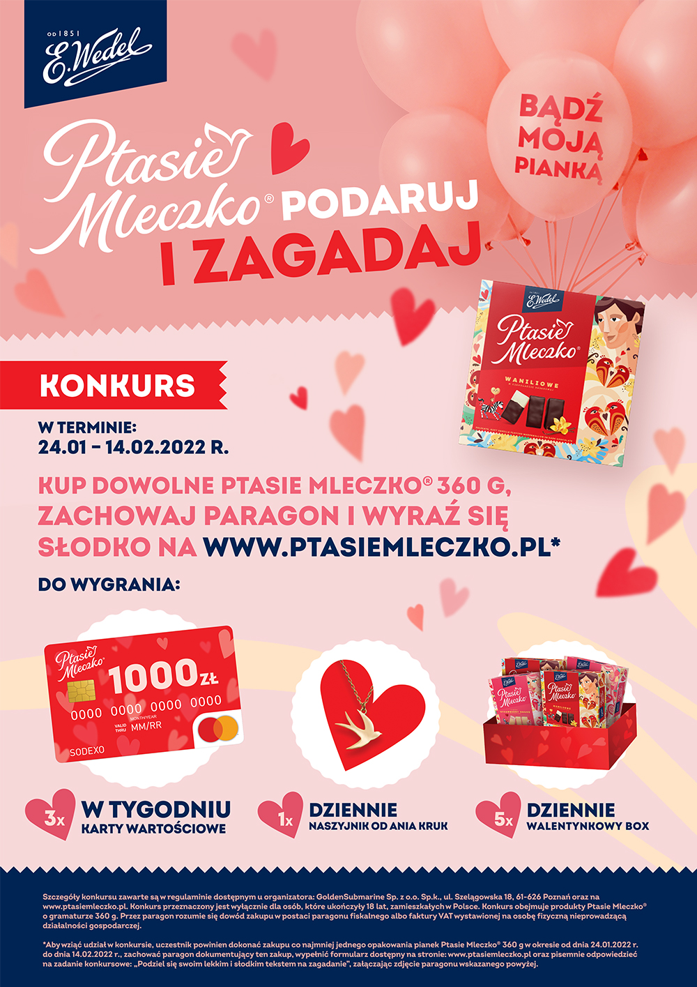 Konkurs pt. „Podaruj i zagadaj” to doskonała okazja do tego, by wykazać się kreatywnością i zdobyć wspaniałe nagrody. Zasady są niezwykle proste. Uczestnicy zobowiązani są do zakupu minimum jednego opakowania pianek Ptasie Mleczko 360 g o dowolnym smaku, zarejestrowania się na stronie: www.ptasiemleczko.pl, uzupełnienia zadania konkursowego, które brzmi: „Podziel się swoim lekkim i słodkim tekstem na zagadanie” oraz dołączenia do niego zdjęcia paragonu, potwierdzającego zakup dowolnego opakowania pianek Ptasie Mleczko.
