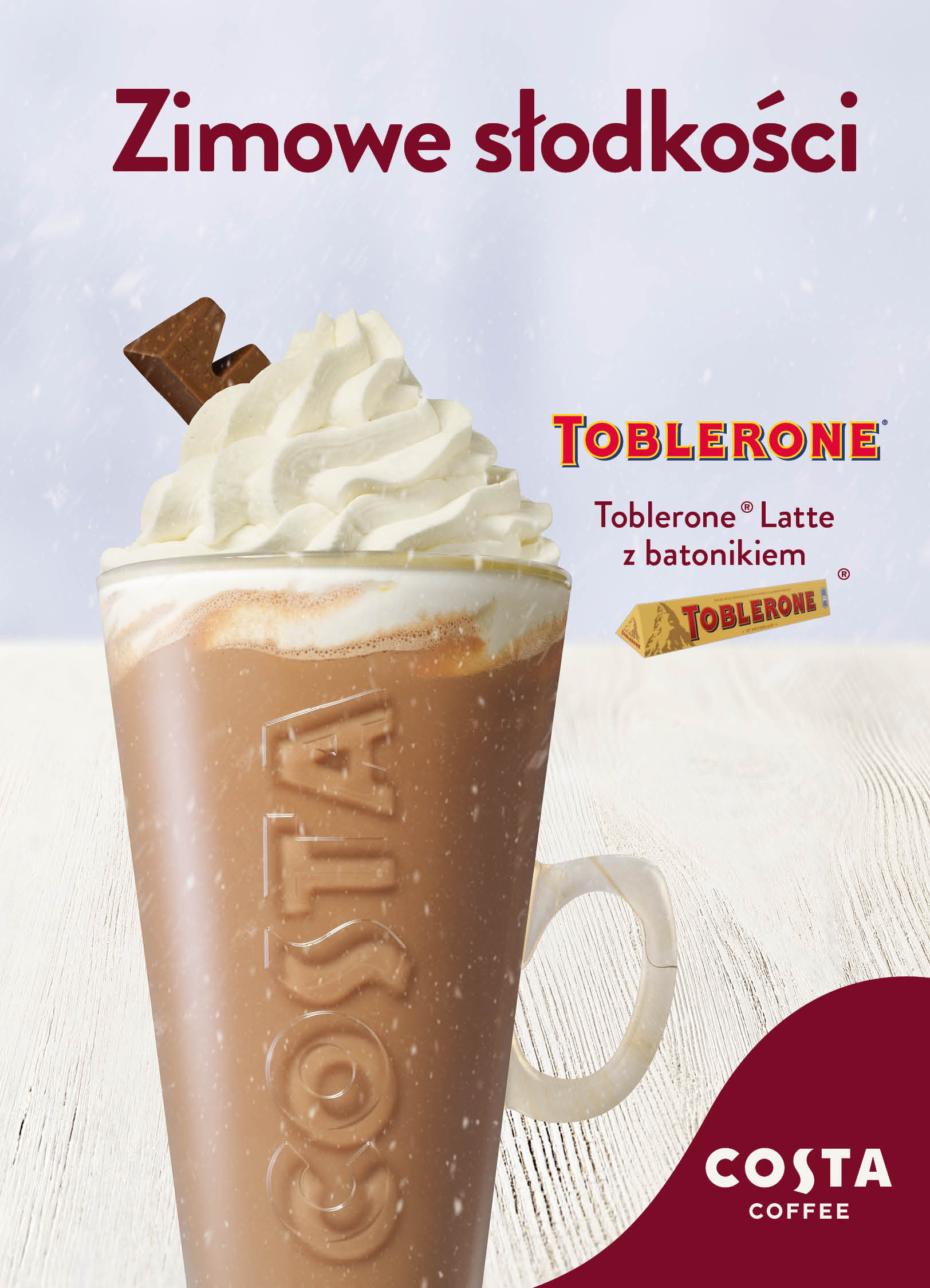 Nowa zimowa kampania w Costa Coffee jak zawsze łączy się z odświeżeniem menu kawowego, jak i dodatkiem pożywnych pozycji śniadaniowo-lunchowych do menu w kategorii food. Dla tych, którzy preferują deserowe, ale i oryginalne oblicze kawy, strzałem w dziesiątkę będzie nowa Toblerone Latte. Stworzony we współpracy z legendarną marką słodyczy napój zachwyca swoim podobieństwem do popularnej czekolady. Słodki smak syropu karmelowego uzupełniany jest nutami miodu oraz mlecznej, gorącej czekolady. Całość zwieńcza lekka bita śmietana, a wraz z kawą podawana jest również mniejsza wersja czekolady Toblerone w postaci mini batonika.