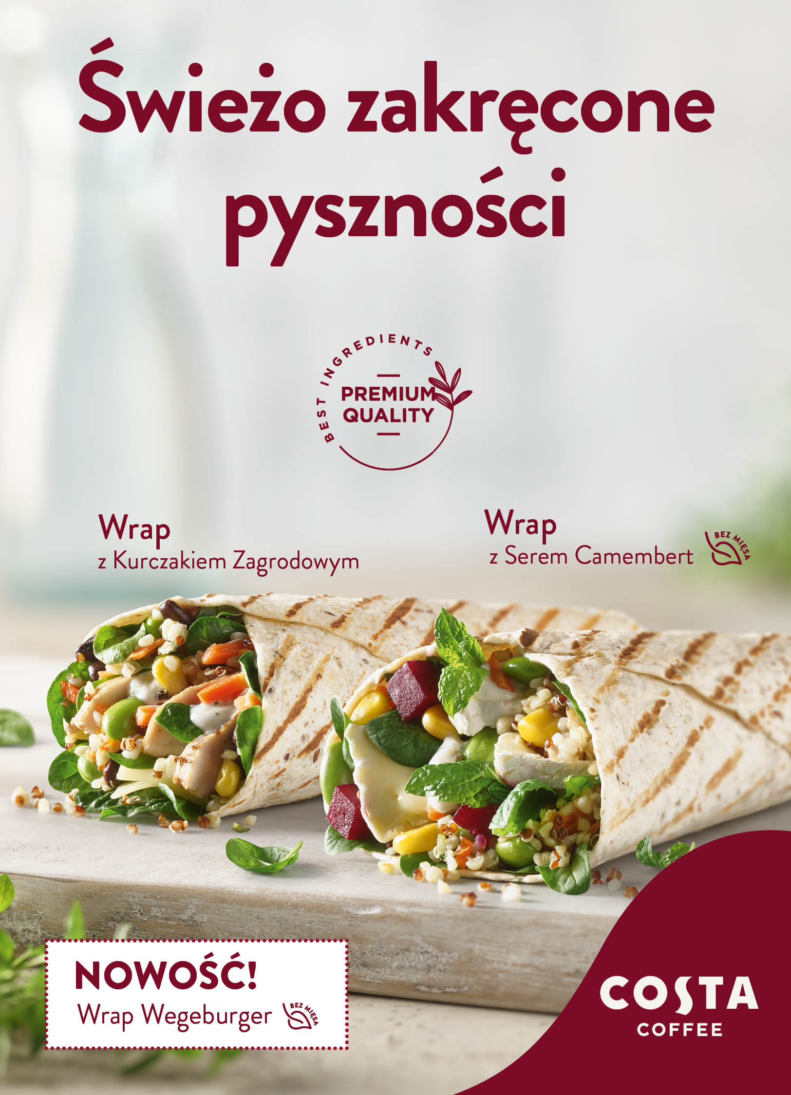 Costa Coffee znana jest także z rozbudowanej oferty śniadaniowej oraz lunchowej, która łączy pożywność z niesamowitym smakiem. W ofercie lunchowej od godziny 12:00 do odkrycia są wyśmienite Wrapy – z kurczakiem lub serem camembert, a także całkowita nowość – Wrap z wegeburgerem. Delikatny kotlet roślinny zyskuje tutaj nową głębię dzięki dodatkowi słodkich buraków oraz chrupiącego szpinaku. Wszystko to owinięte świeżą, pełnoziarnistą tortillą.