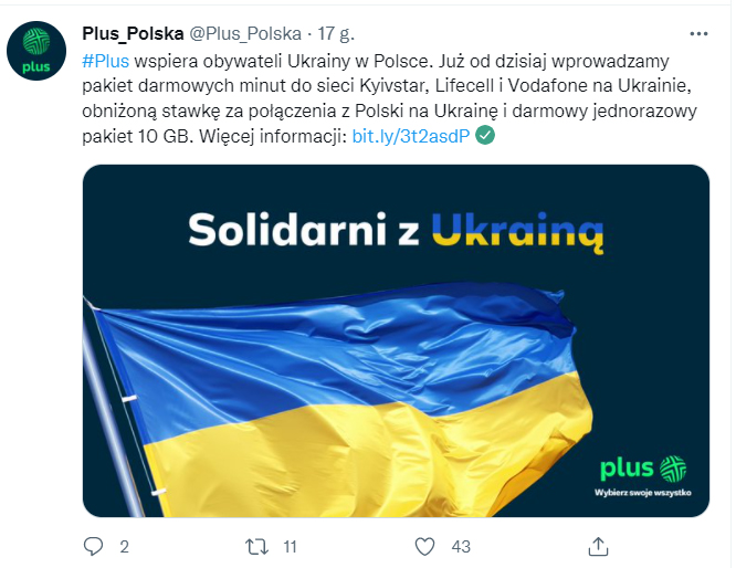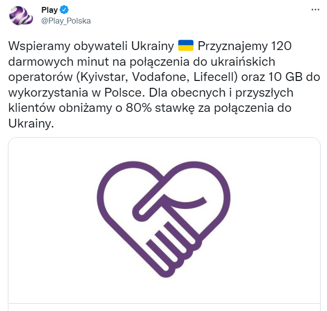Play poinformował, że chce „zapewnić możliwość kontaktu z bliskimi oraz dostęp do aktualnych informacji”. Operator od 25 lutego daje klientom po 120 darmowych minut na połączenia do największych ukraińskich operatorów. Są to sieci Kyivstar, Vodafone, Lifecell.