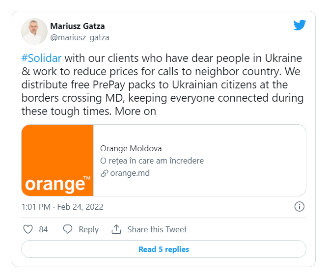 Orange Polska także przygotował ofertę w związku z atakiem Rosji na Ukrainę. Od jutra operator obniży zarówno w ramach taryf Orange, jak i nju mobile ceny połączeń międzynarodowych z Polski na Ukrainę o ponad 80% do 29 groszy za minutę na numery stacjonarne i komórkowe aż do 10 marca 2022 r. W przypadku oferty Orange Flex można będzie aktywować pakiet 100 minut na 30 dni za 0 zł po wpisaniu kodu UKRAINA w aplikacji.