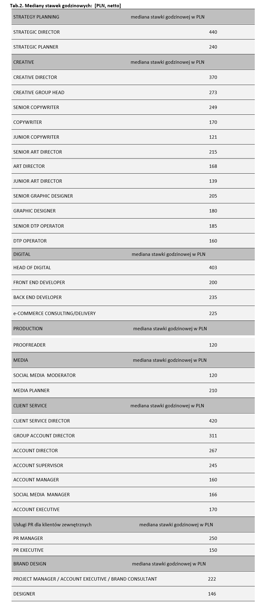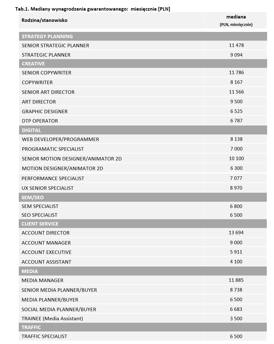W tabelach poniżej zaprezentowano wartość rynkową mediany dla typowych stanowisk w branży komunikacji marketingowej dla płacy gwarantowanej brutto.