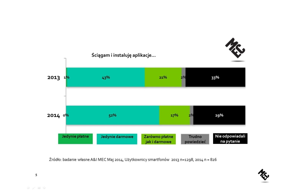 Smartfonowcy coraz częściej instalują na swoich telefonach dodatkowe aplikacje – ściąga je już 72 proc. właścicieli tych urządzeń, o 5 p. proc. więcej niż rok wcześniej. Większość użytkowników ma jednak nie więcej niż 10 dodatkowych aplikacji. Większość użytkowników poprzestaje na darmowych opcjach. Mając do wyboru płatne aplikacje bez reklam i bezpłatne z reklamami, wolimy nie płacić, a w zamian mieć styczność z komunikacją marketingową. Tylko 17 proc. właścicieli smartfonów ściąga zarówno płatne jak i bezpłatne aplikacje i – co ciekawe – odsetek użytkowników, którym zdarza się za nie płacić, lekko spadał na przestrzeni dwóch ostatnich lat.