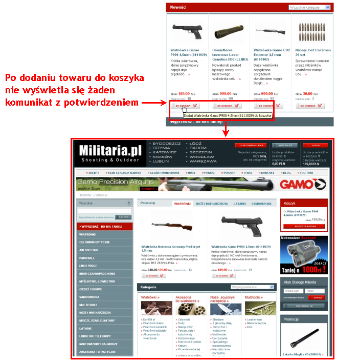Pierwszym etapem prac był audyt użyteczności serwisu Militaria.pl, na który składała się heurystyczna ocena ekspercka oraz badania z użytkownikami w laboratorium Symetrii (poszerzone o eye tracking). W sumie w badaniach brało udział 4 ekspertów oraz 6 przedstawicieli grupy docelowej e-sklepu.