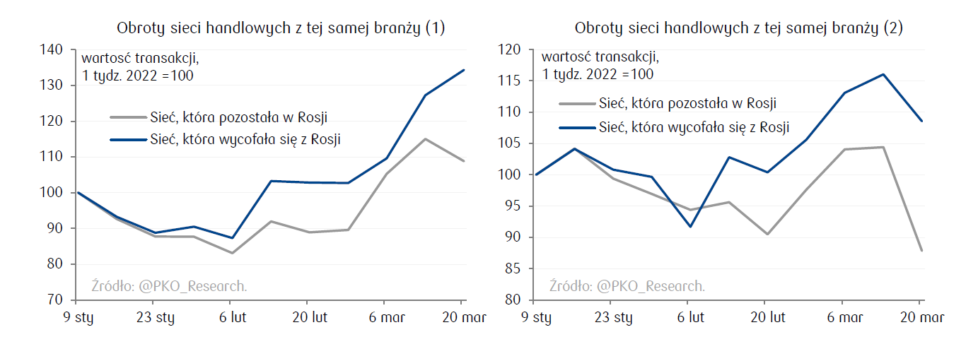 Centrum Analiz banku zaprezentowało informacje o płatnościach kartami PKO BP w sklepach sieci, które wycofały się z Rosji oraz tych, które pozostały na tamtejszym rynku. Wykres pokazuje wyraźny spadek obrotów tych drugich.