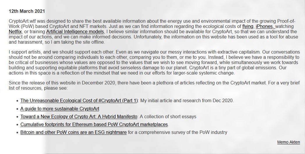 – Kryptoart.WTF zostało zaprojektowane w celu udostępniania informacji o zużyciu energii i wpływie na środowisko rosnących rynków kryptoart i tokenów NFT. Danych opartych na dowodach pracy – PoW. Tak jak możemy znaleźć informacje dot. środowiskowych kosztów lotów, używania iPhonów, oglądania Netflixa czy rozwijania AI – tak uważam, że podobne informacje powinny być dostępne dla kryptoart. Po to, abyśmy mogli zrozumieć wpływ naszych działań. Niestety informacje na tej stronie były wykorzystywane jako narzędzie do nadużyć i nękania. Dlatego zdecydowałem o wyłączeniu witryny – czytamy w oświadczeniu sporządzonym przez Memo Aktena.