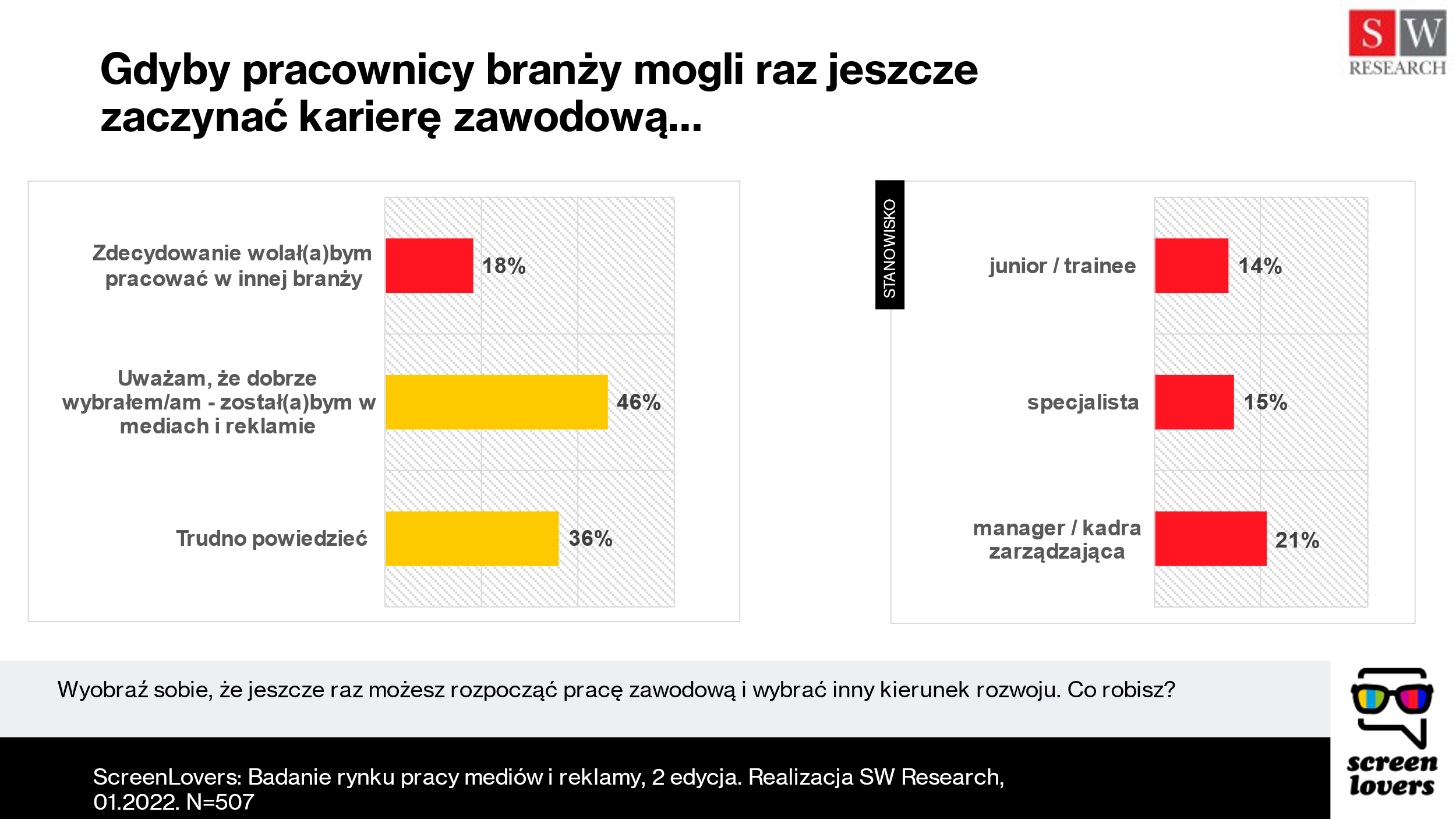 Blisko połowa pracowników firm z rynku mediów i reklamy, gdyby jeszcze raz wybierała drogę zawodową, powtórzyłaby swój wybór. Niemal co piąty dziś inaczej pokierowałby karierą, – pokazuje II edycja badania rynku pracy w mediach i reklamie zrealizowana przez ScreenLovers i SW Research we współpracy z grupą partnerów branżowych (IAB Polska, SAR, Sektorowa Rada ds. Kompetencji, Rocket Jobs).