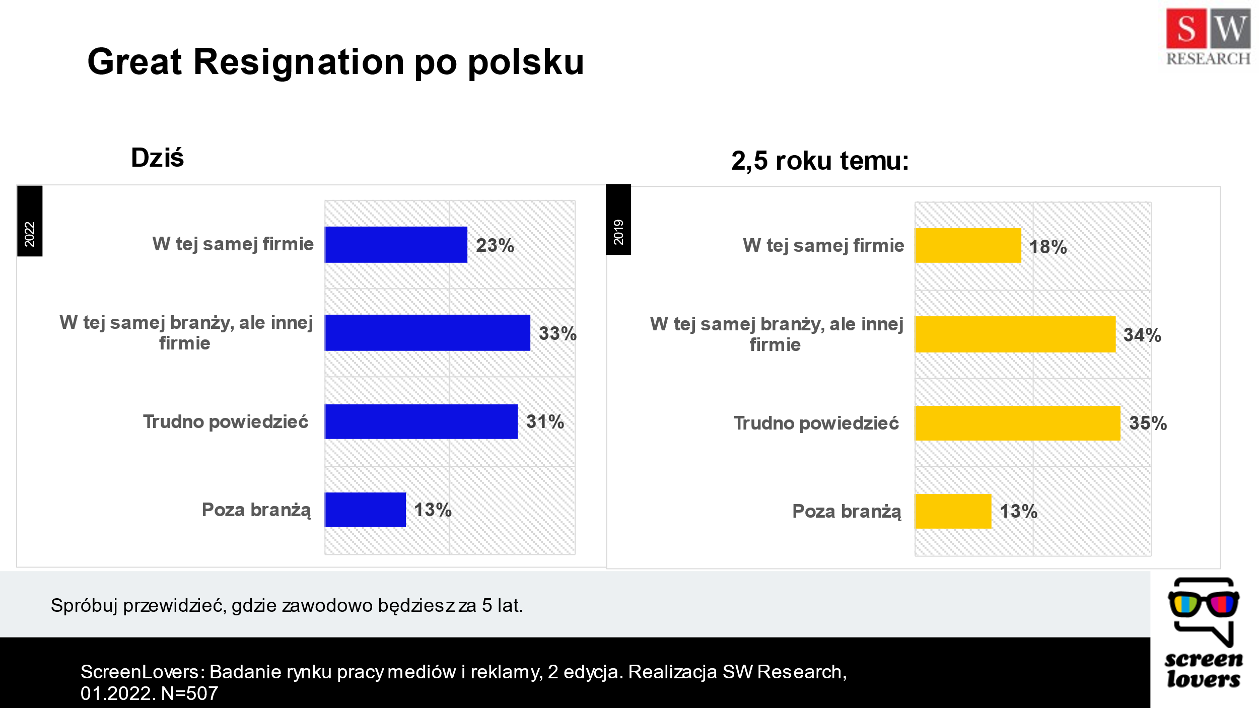 Za 5 lat niemal co czwarty pracownik branży (a ponad 40 proc. osób po 45 r. życia) planuje pracować w tej samej firmie. Jedna trzecia widzi się w branży, ale już w innej firmie, a 13 proc. uważa, że będzie poza rynkiem mediów i reklamy. To odczyt bardzo zbliżony do wyników z jesieni 2019 roku, gdy ScreenLovers i SW Research również pytały o plany w perspektywie 5 lat. W połączeniu z mniejszą dziś podatnością branżowych kadr na jakiekolwiek pozapłacowe motywatory przy ewentualnej zmianie pracy, sugeruje to, iż raczej w sferze haseł pozostaje w Polsce osławione za oceanem zjawisko Great Resignation.