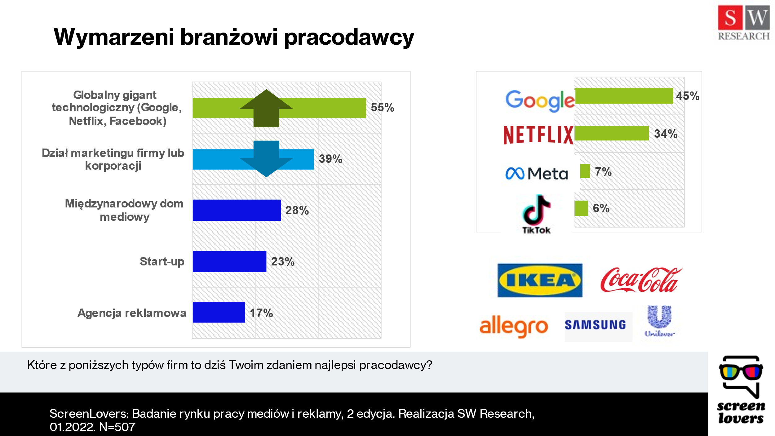 Wśród konkretnych firm z tych dwóch najpopularniejszych kategorii warto zauważyć pozycje Google i Netfliksa oraz najczęściej spontanicznie wymienianych korporacji i firm, jak IKEA, Allegro, Coca-Cola, Unilever czy Samsung, w działach marketingu których chętnie widzieliby się badani przez ScreenLovers i SW Research pracownicy branży mediowo-reklamowej.