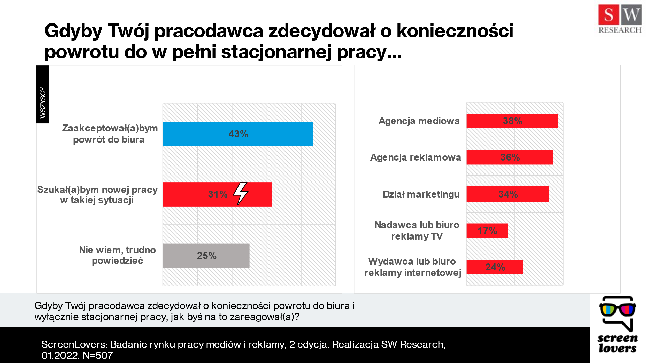 ScreenLovers i SW Research w badaniu przyjrzały się też m.in. zjawisku pracy zdalnej. W czasie realizacji badania (cały styczeń 2022 r.) ponad 2/3 badanych pracowało wyłącznie lub głównie zdalnie. W sytuacji gdyby ich pracodawcy zdecydowali o powrocie do w pełni stacjonarnej pracy w biurze, 31 proc. osób twierdziło, że zaczęłoby szukać nowej pracy. Najczęściej deklarowały tak kobiety (35 proc.), pracownicy przed 34 r. życia (39 proc.) oraz pracownicy agencji – mediowych i reklamowych, częściej pracujący zdalnie niż np. przedstawiciele biur reklamy.