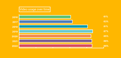 Według raportu Wyzowl z 2022, aż 86% firm korzysta z video marketingu, a aż 92% marketerów wskazuje video marketing jako kluczową strategię, którą zamierza kontynuować*. Jak widać, liczby te są pokaźne i wskazują z roku na rok wzrosty.